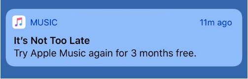 目前,AppleMusic的推送消息有兩種版本,標題分別是第一種是“我們改變了!”,第二種是“現在還不算太晚”,內容都是相同的,可以享受第二次AppleMusic3個月免費試用。