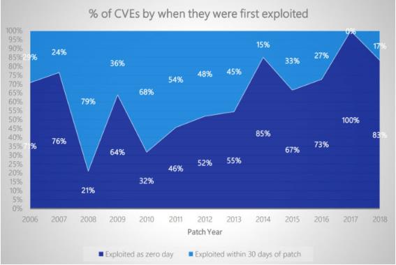 這說明了微軟的安全部門工作起到了作用,且微軟像DEP,ASLR和改進的沙盒等的安全功能運行效果良好。過去的幾年,在Windows分發補丁的30天內,漏洞被利用的比例只占2%到3%,在這期間內發布非0day漏洞現在也變得不常見。