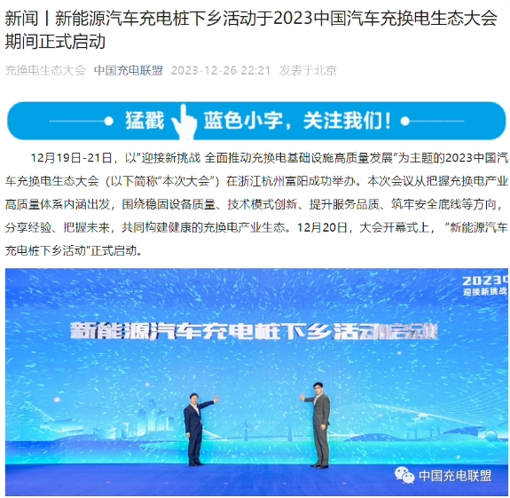 在近日舉辦的 2023 中國汽車充換電生態(tài)大會上,“新能源汽車充電樁下鄉(xiāng)活動”正式啟動。